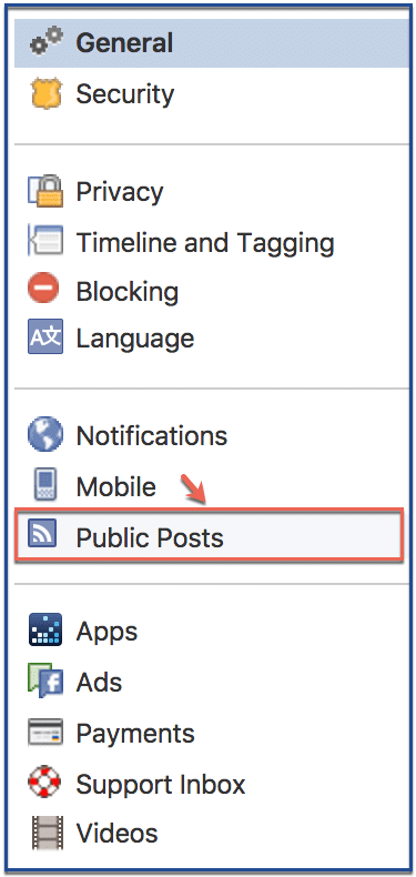 In your account settings, scroll down until you find “Public Posts.” Click “Public Posts.”
