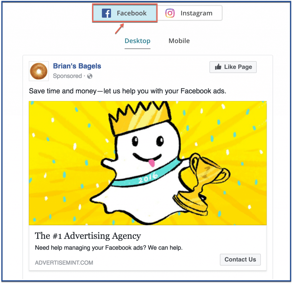 You can preview your ad once you’re done. Click “Facebook” for a preview of the Facebook ad and click “Instagram” for a preview of the Instagram ad.