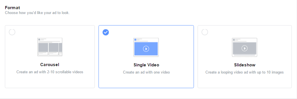 A video views objective is eligible for the video, carousel, and slideshow format. You can choose your format in the “Format” section when creating the ad.