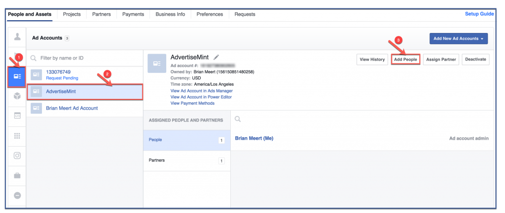 Go to your ad account by clicking the third icon under “People and Assets“. This will take you to a list of your ad accounts. Choose the ad account you want your employee access to under “Ad Accounts” then click “Add People“.