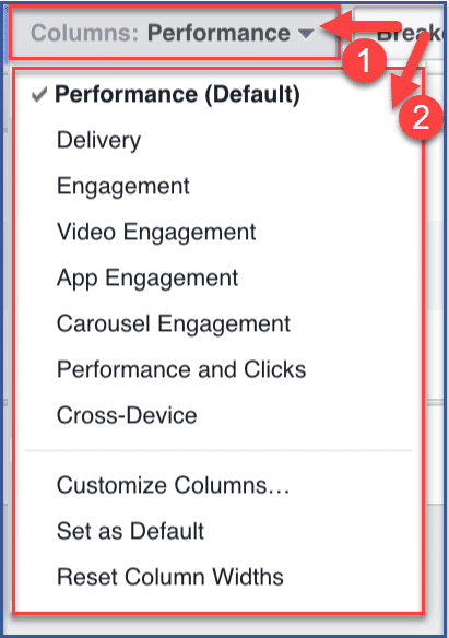 If you want to know how your campaigns are doing, you can do that by clicking the “Columns: Performance” tab. You can also choose specific performances you want to view such as delivery, engagement, video engagement, and app engagement, among many others. All of the options are listed on the image below.